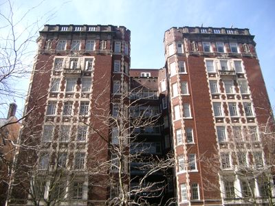 Los Apartamentos Ambassador se elevan nueve pisos con elementos de diseño Tudor Revival, incluyendo patrones decorativos de entramado y tejados empinados.