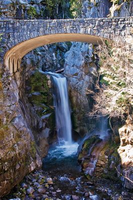 El Puente de las Cascadas Christine presenta un diseño de arco de hormigón armado revestido de piedra que atraviesa el arroyo Van Trump en la carretera Nisqually.