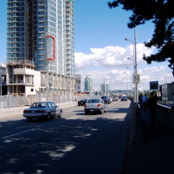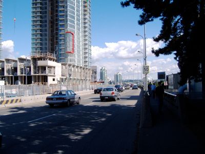El viaducto transcurre entre el Rogers Arena y el Estadio BC Place, funcionando como ruta principal para vehículos que entran y salen del este del centro.