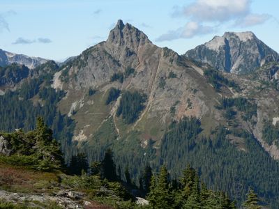 La Montaña Huckleberry alcanza una elevación de 6.230 pies con terreno rocoso y forma piramidal en la región Alpine Lakes Wilderness.