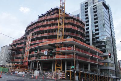 El edificio McKenzie se eleva 450 pies sobre el horizonte de Seattle con su forma elíptica y exterior de cristal reflejando el paisaje urbano.