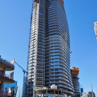 La estructura incluye espacios comerciales a nivel de calle, estacionamiento subterráneo y áreas para bicicletas accesibles para inquilinos y visitantes.