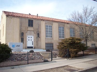 El edificio AT&T se encuentra en la intersección de Pine y Third Street, definido por paredes de estuco característico y techos de tejas rojas en estilo Renacimiento Colonial Español. Sus muros de mampostería gruesa y ventanas compactas dan a la estructura una apariencia sólida y duradera adaptada al clima desértico.