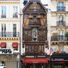El edificio muestra una fachada estrecha con entramado de ladrillo y madera, con tres pisos superiores y un ático sobre la planta baja.