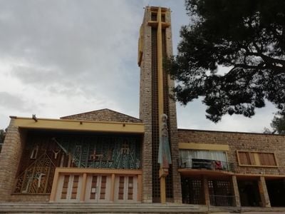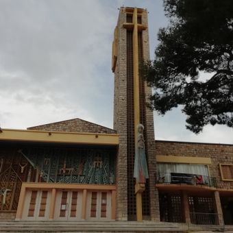 La fachada muestra cinco esculturas de hormigón de Jean Lambert Rucki que representan momentos esenciales de la vida de María.