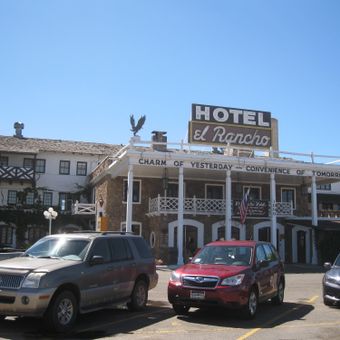 El Hotel El Rancho presenta arquitectura rústica con un gran pórtico, balcón central y escaleras gemelas construidas con troncos que conducen a las habitaciones superiores.