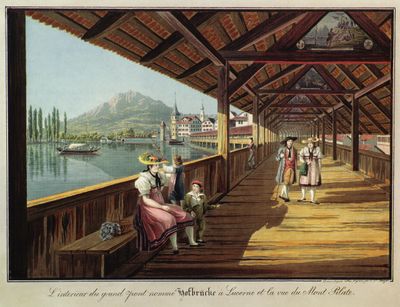 El Hofbrücke era un puente de madera cubierto en Lucerna que se extendía a traves de una bahía del lago de Lucerna durante unos 385 metros. Su pasaje tenía un techo decorado con paneles pintados triangulares.