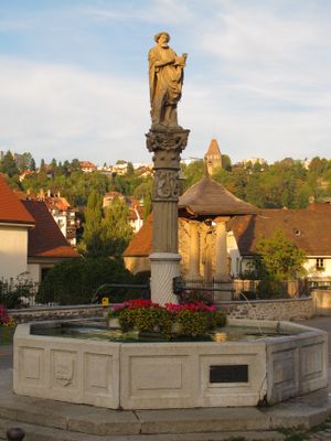 Fountain of St. John, decorative fountain with statue in the city of Fribourg, Switzerland