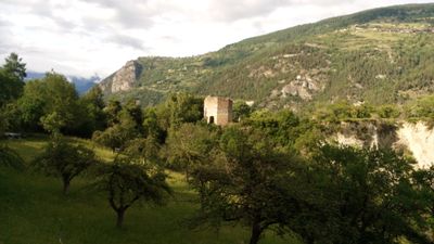 Ruins of the medieval Tavelli Tower, tower ruine in Vex in the canton of Valais, Switzerland