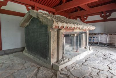 El santuario de piedra presenta paredes negras de 4,14 metros de largo, 2,5 metros de ancho y se eleva 2,64 metros en la montaña Xiaotang.