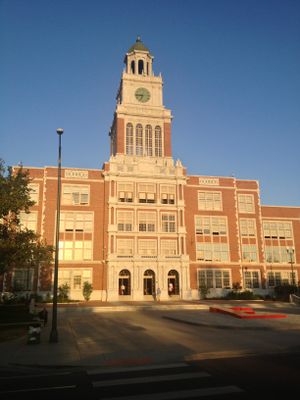La Escuela Secundaria del Este exhibe paredes de ladrillo rojo, detalles en piedra y grandes ventanas arqueadas distribuidas en varios pisos con estilo arquitectónico Neoclásico.
