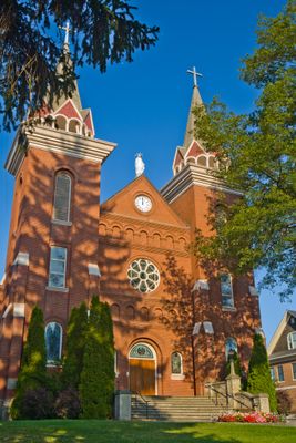 La iglesia presenta dos torres prominentes, una estatua de siete pies de la Santísima Madre y múltiples vidrieras que representan escenas religiosas.
