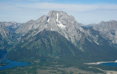 El Monte Moran se eleva 1800 metros sobre el lago Jackson, exhibiendo rocas ígneas y metamórficas antiguas con una formación vertical de diabasa negra.