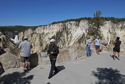 El mirador se eleva sobre el Gran Cañón del río Yellowstone, mostrando las cataratas Lower Falls de 94 metros y paredes naranjas.