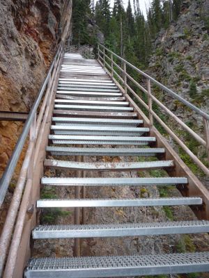 Una escalera metálica de 328 peldaños desciende por la pared del cañón hacia una plataforma de observación de las Cataratas Lower Yellowstone.