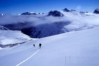 El campo de hielo fue explorado a principios del siglo 20 por alpinistas del Alpine Club of Canada, quienes construyeron dos refugios de montana alli. Estos refugios apoyaron muchas expediciones en las cumbres y marcaron como se accedia a esta region remota.