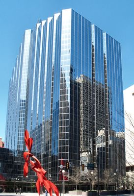 La plaza este presenta una escultura metálica de 45 pies de altura llamada Galaxy, creada por Alexander Liberman.