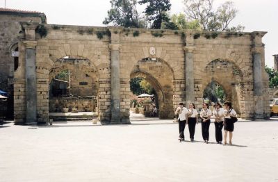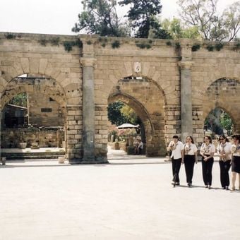El palacio presenta tres grandes arcos sostenidos por columnas romanas de Salamis, con tallas en piedra que adornan su fachada principal.