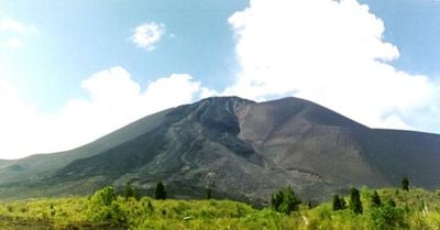 El volcán Soputanpatepangan se eleva 1.952 metros sobre el nivel del mar, con laderas empinadas de roca andesita y múltiples picos.