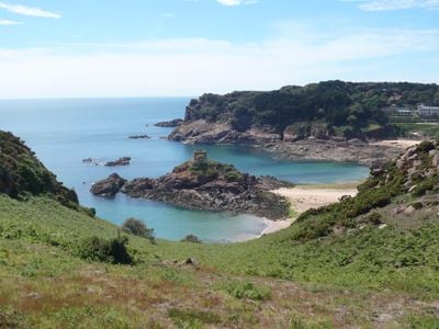 Portelet Bay es una pequeña cala en la costa sur de Jersey con una playa de grava y aguas poco profundas ideales para vadear. La orilla está rodeada de acantilados y ofrece vistas hacia las formaciones rocosas cercanas y el mar abierto.