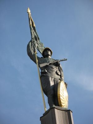El Monumento de Guerra Soviético presenta una estatua dorada y negra de un soldado sobre una columna de mármol, rodeada de una columnata semicircular blanca.