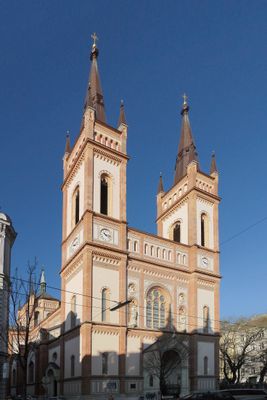 La construcción de la iglesia comenzó en febrero de 1848 bajo la dirección de Paul Sprenger, pero los eventos de la Revolución Húngara interrumpieron el trabajo y llevaron a cambios en el diseño original. Este periodo turbulento definió la forma arquitectónica final del edificio.
