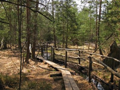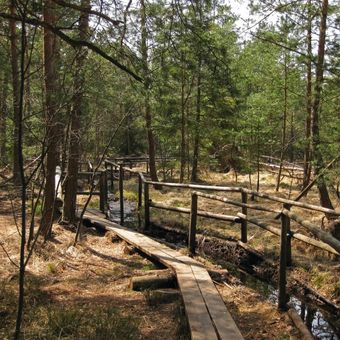 Dos senderos señalizados guían a los visitantes por el parque: uno de 2,7 kilómetros por la turbera y otro de 3,7 kilómetros por el bosque.