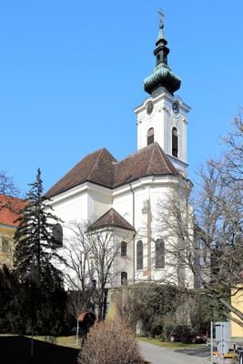 La iglesia se eleva sobre una colina con su arquitectura barroca y entrada sur decorada con el escudo de armas del Cardenal Kollonitsch.
