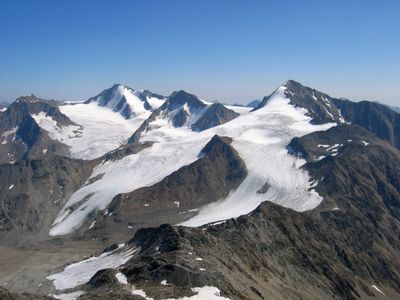 El glaciar Niederjochferner se extiende hacia el noroeste desde la montaña Similaun, con brazos occidentales y orientales entre territorios austriacos e italianos.