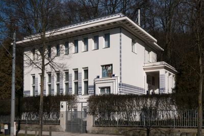 Villa Wagner II es un edificio residencial protegido en Penzing con patrones geométricos en su fachada, ornamentos azules y un techo plano con cornisa extendida en Hüttelbergstraße 28. La estructura muestra las características de la arquitectura secesionista con líneas limpias y elementos funcionales.