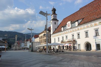 La Hauptplatz sirve como plaza pública principal de Leoben, con pavimento de piedra y elementos arquitectónicos que reflejan las tradiciones constructivas locales.