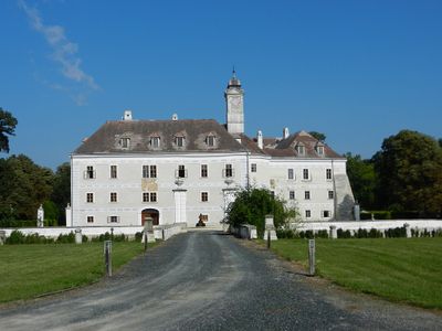 Un puente de piedra cruza el antiguo foso, que una vez recibió agua del río Fischa y protegió la estructura fortificada. Los pedestales barrocos en la puerta del castillo todavía marcan esta entrada histórica hoy, mostrando refinamiento artístico después de la era defensiva.