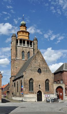 La Cruz de Jerusalén corona la torre de la iglesia, mientras que las antiguas casas de beneficencia adyacentes ahora albergan el Kantcentrum, Centro de Encaje de Brujas.