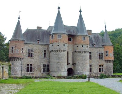 El castillo de piedra se levanta en una isla formada por el río Bocq, con muros macizos, torres cubiertas de pizarra y un foso con puente levadizo.