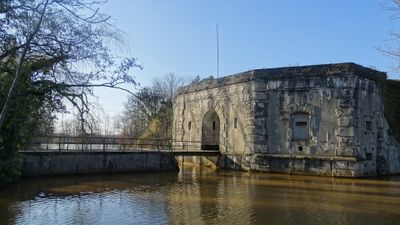 El Fuerte de Stabroek muestra una estructura trapezoidal de hormigón armado con un foso circundante conectado al sistema del canal antitanque.