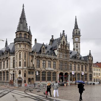 La Oficina de Correos Antigua es un monumento protegido en el centro de Gante, Bélgica, diseñado por el arquitecto Louis Cloquet y con una torre de reloj de 52 metros que se eleva sobre las calles circundantes. Su fachada muestra estatuas que representan provincias belgas y jefes de estado europeos, creando un exterior ornamentado que refleja el diseño del principio del siglo XX.