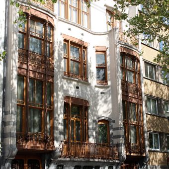 La Casa Solvay exhibe balcones curvos de piedra, elementos de hierro fundido y grandes ventanales en su fachada simétrica de caliza con patrones decorativos.