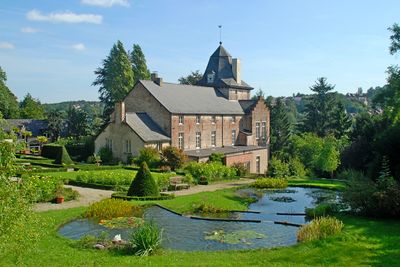 El Castillo de Ottignies se levanta sobre un terreno ondulado rodeado de jardines y muestra una arquitectura tradicional con torres y muros de piedra.