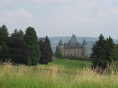 El castillo de piedra se alza entre las colinas de Valonia, exhibiendo arquitectura tradicional belga con líneas geométricas y elementos simétricos.