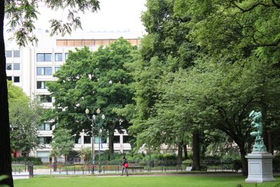 La Plaza de Meeûs presenta jardines diseñados con senderos pavimentados, rodeada de edificios neoclásicos y estructuras de oficinas en el distrito central.