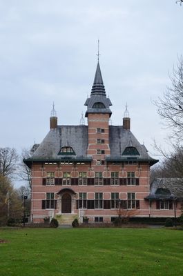 El edificio Kasteel Hens combina ladrillo y arenisca en su construcción, siguiendo los principios de la arquitectura neorrenacentista flamenca con fachadas simétricas y elementos decorativos.