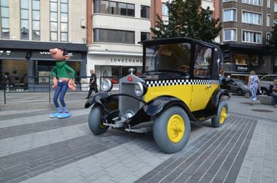 La estatua muestra a Gaston Lagaffe junto a su Fiat 509, observando una señal de prohibido estacionar a tamaño natural.