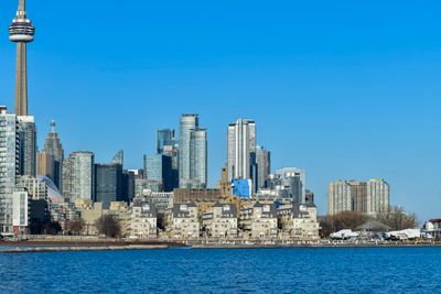 La ciudad se extiende a lo largo del lago Ontario sobre unos 630 kilómetros cuadrados con más de 70 barrios distintos. Edificios de gran altura dominan el horizonte, y la CN Tower alcanza 553 metros, convirtiéndola en la estructura autoportante más alta del hemisferio occidental. La red de calles sigue un patrón regular con Yonge Street como eje principal norte-sur.