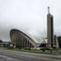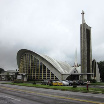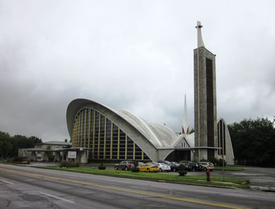 El diseño en forma de abanico de la catedral incluye arcos estructurales de hormigón con tensores pretensados, creando líneas dinámicas en el techo.