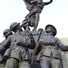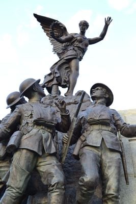 El monumento de granito y bronce presenta tres soldados en una trinchera con una figura angelical extendiendo las alas sosteniendo una corona de laurel.