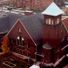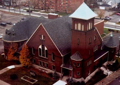 La iglesia de ladrillo rojo de estilo románico Richardson presenta una torre campanario y ocupa una posición central en el área.