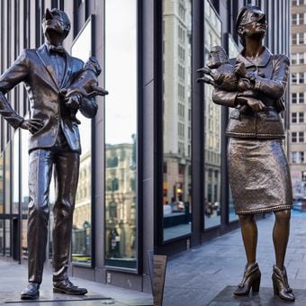 Dos figuras de bronce separadas se alzan en esquinas opuestas de un edificio, cada una sosteniendo una raza diferente de perro.