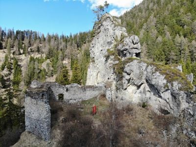 Los restos de piedra del Castillo Greifenstein se encuentran a 1,246 metros sobre el nivel del mar encima del túnel helicoidal del Ferrocarril Rético.