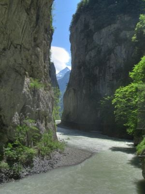 La Garganta del Aare se extiende por 1.400 metros a través de acantilados de piedra caliza, alcanzando profundidades de 200 metros con agua fluyendo.