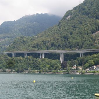 El Viaducto de Chillon se extiende 2150 metros sobre el Lago Ginebra con dos vigas paralelas que sostienen los carriles este y oeste de la autopista A9.